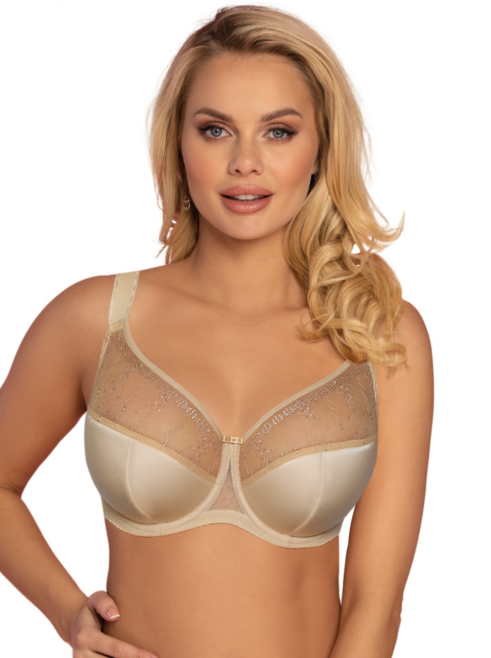 Bardzo szykowny biustonosz o kroju semi-soft dla kobiet ceniących wyrafinowaną a zarazem bardzo wygodną bieliznę. Ornamentowy haft na miseczkach i ozdobne ramiączka dodają elegancji i kobiecości a biustonosz może stanowić bazę do wielu stylizacji. Biustonosz półusztywniany uszyty jest z włoskiej mikrofibry połączonej z tiulem (górna część miski, środek oraz obwód biustonosza). Ramiączka szerokie dla lepszego podtrzymania biustu, ozdobne, nieodpinane i regulowane dla lepszego dopasowania do sylwetki. Biustonosz pięknie zbiera i unosi biust, nadając mu naturalny, zaokrąglony kształt.