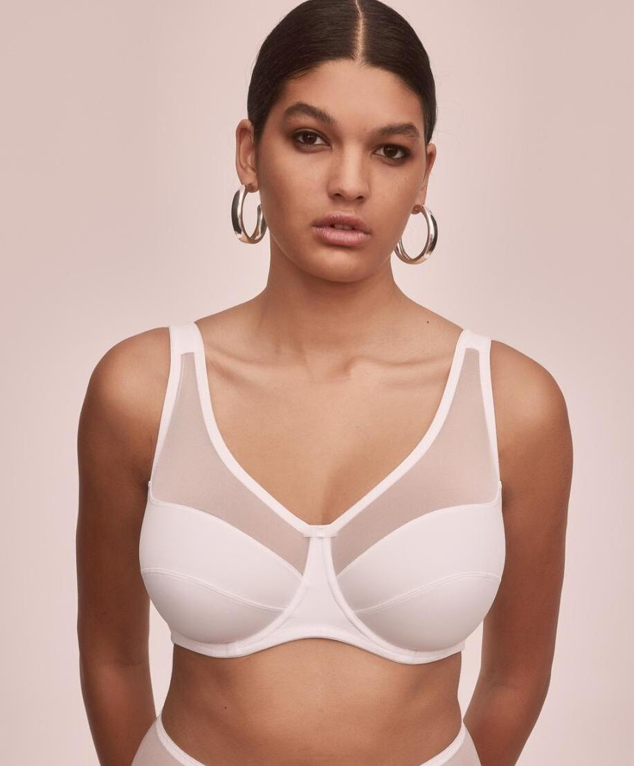 Komfortowy biustonosz na fiszbinach dobrze podtrzymujący większy biust, standardową miseczkę połączono z delikatnym tiulem, miseczki dodatkowo wyścielone bawełną, szerokie ramiączka wzmocnione bawełną oraz miękką pianką, trzyrzędowe zapięcie.