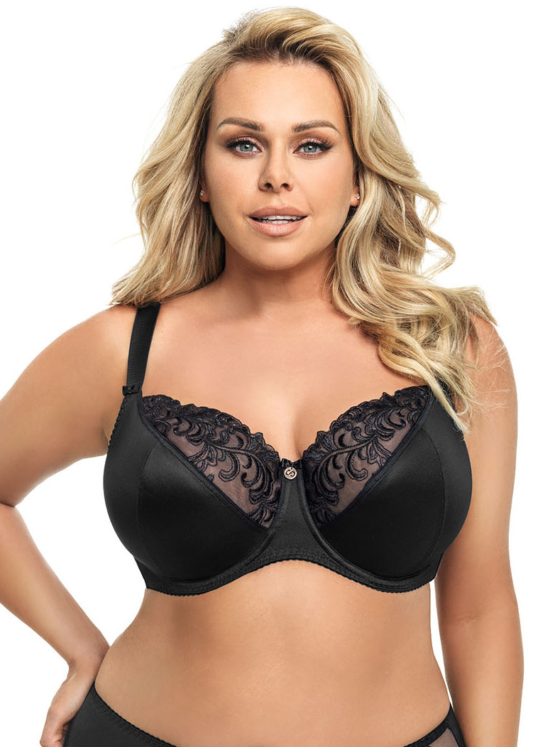 Klasyczny miękki biustonosz. Wykonany z gładkich surowców połączonych eleganckim haftem. Miseczki dobrze zbierają biust i utrzymują na właściwym miejscu, ładnie eksponując dekolt. Dolna część miseczek wykonana ze stabilnej, gładkiej, matowej dzianiny. Górna część wykonana jest z haftu dla wzmocnienia podszytego delikatną siateczką. Na środku, pomiędzy miseczkami kokardka ozdobiona malutką biżuterią.