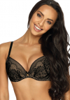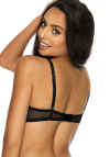 Elegancki push up otulony zmysłową koronką. Model posiada kieszonki na wkładki i regulowane, odpinane ramiączka . U styku miseczek znajduje się kokardka. Zapinany na podwójne haftki z trzystopniową regulacja zapięcia. Model podsiada boczne fiszbiny które zbierają biust do środka. Tył z gładkiego materiału siateczkowego.