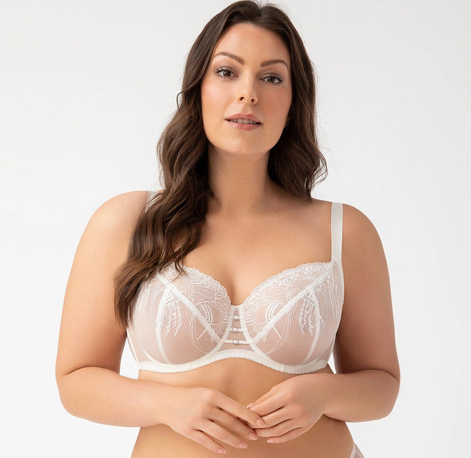 Biustonosz miękki BIG dla kobiet ze średnim i dużym biustem podwyższony mostek ramiączka odsunięte do boku – biust zebrany mocno do środka efekt bardzo mocnego uniesienia biustu 3-częściowy podział misek 3 szerokości ramiączka (14, 18, 22) haftka z trzy stopniową regulacją obwodu 2 rzędowa- ramiączko 14 3- rzędowa – ramiączko 18, 22 MISKI DOLNE MISKI: tiul stabilny +haft GÓRNE MISKI: haft podszyty tiulem stabilnym, górna krawędź wykończona taśmą silikonową PAS OBWODU: wyprofilowany mostek z 2 warstw tiulu stabilnego + 3 ozdobne paseczki z regulatorami transparentna lycra o strukturze siatki zapewniająca bardzo dobre podtrzymanie na bokach płaskie fiszbiny, aby biustonosz idealnie przylegał do ciała. Metalowe kółka i regulatory w kolorze srebrnym (nie zawierają niklu),