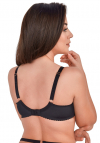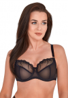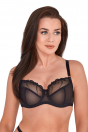 Czarny, miękki biustonosz Kira, pięknie układa się na ciele. Elegancki model o konstrukcji S9. Nowoczesny haft pokrywa elementy na misce górnej. Miseczka dolna ze stabilnego, czarnego tiulu. Plecy odcinane, uszyte z elastycznej Lycry.