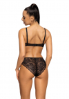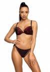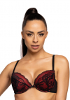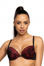 Seksowny biustonosz push-up o kroju plunge w kolorze czarno-czerwonym. Model idealnie zbiera piersi, nadaje kształt oraz pasuje do głębokich dekoltów. Biustonosz Mollie został wykonany z efektownej czarnej koronki, która pięknie układa się na piersi. Wewnętrzna strona miseczki podszyta czerwoną pianką gorseciarską. Plecy z delikatnej siatki elastycznej. Ramiączka regulowane, odpinane. Haftka dwurzędowa z trójstopniową regulacją.