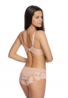 Cudownie kobiecy, model Keto z półusztywnianymi miseczkami. Doskonale znana konstrukcja SS10, bardzo ładnie zbiera piersi. Jasnoróżowy kolor niezwykle komponuje się z delikatną dla skóry koronką połączoną z nierozciągliwym tiulem. Wzór na bieliźnie jest wyjątkowy.