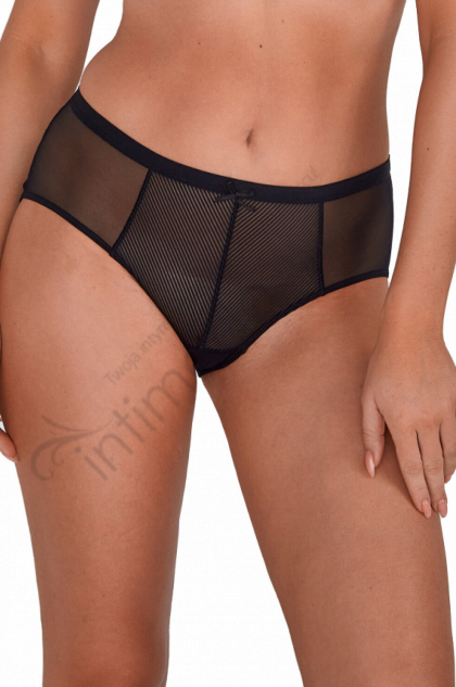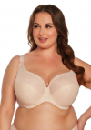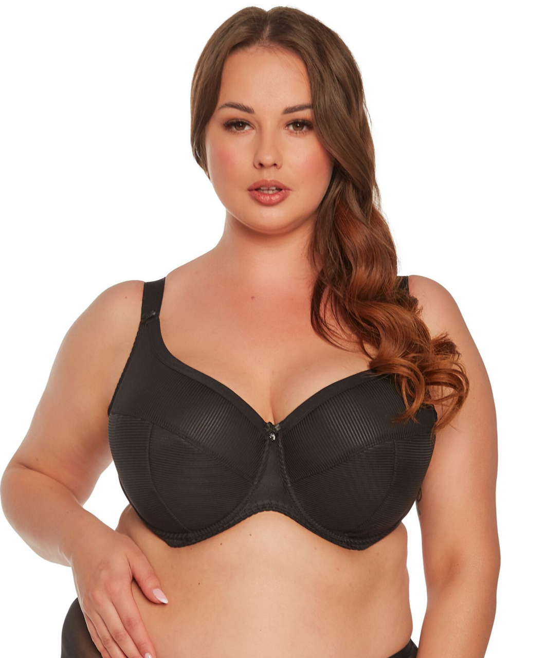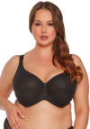 Biustonosz półusztywniony, miseczki wykonane z mikrofibry w prążek, dolna częśc miseczki od wewnątrz poszyta bawełną, górna linia wykończona płaską lamówką, ramiączka nieodpinane Biustonosz zapwenia doskonałe podtrzymanie i piękny dekolt z gładkim wykończeniem. Brak fiszbin bocznych. Tkaniny wykorzystane do stworzenia tej nietuzinkowej konstrucji są elastyczne dzięki czemu biustonosz doskonale sprawdza się u właścicielek obfitych kształtów.