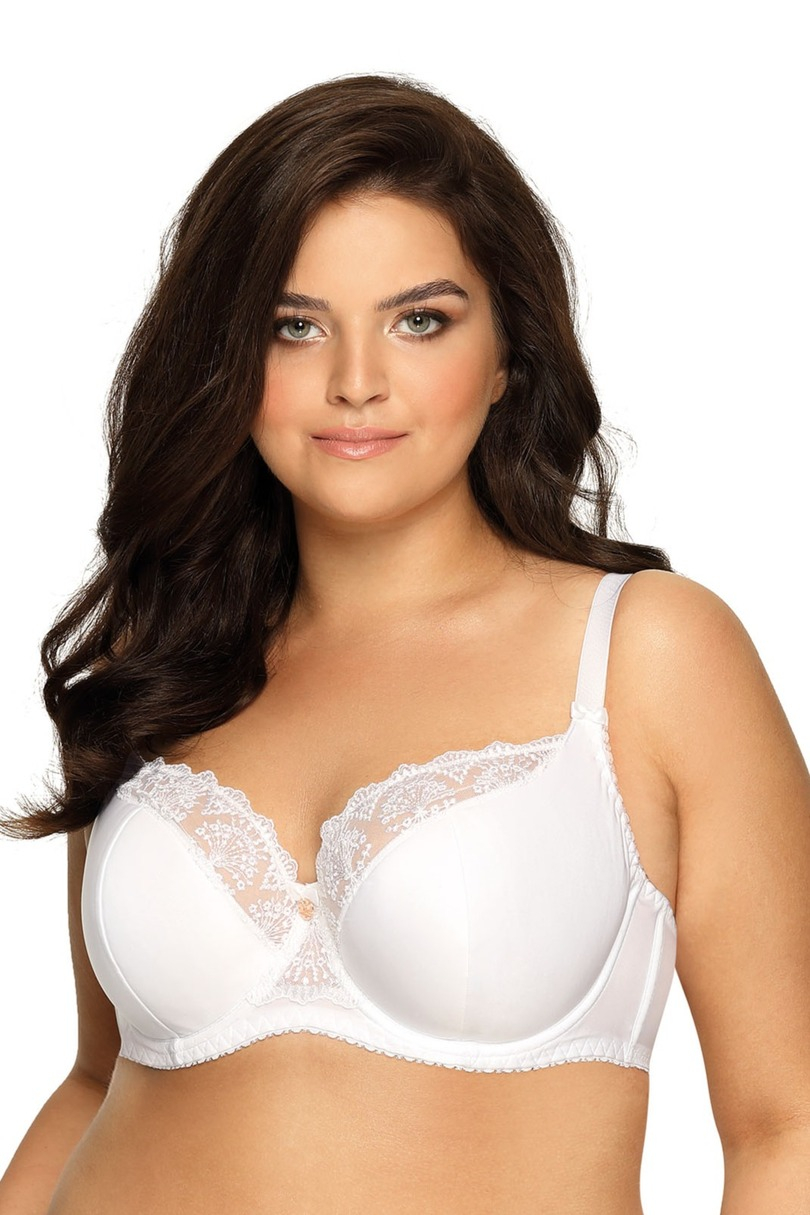 Urok prostoty i czar niewinności aż biją od modelu Freesia. Miseczki wykonane z elastycznej dzianiny podszytej miękka pianką oraz ozdobnego haftu w górnej części idealnie zbierają i unoszą biust. Sprężysty obwód przylega do ciała i doskonale stabilizuje biustonosz. Koronkowy mostek ozdobiony subtelną kokardką z logowanym medalikiem w kolorze różowego złota zachwyca delikatnością i dodaje powabu.
