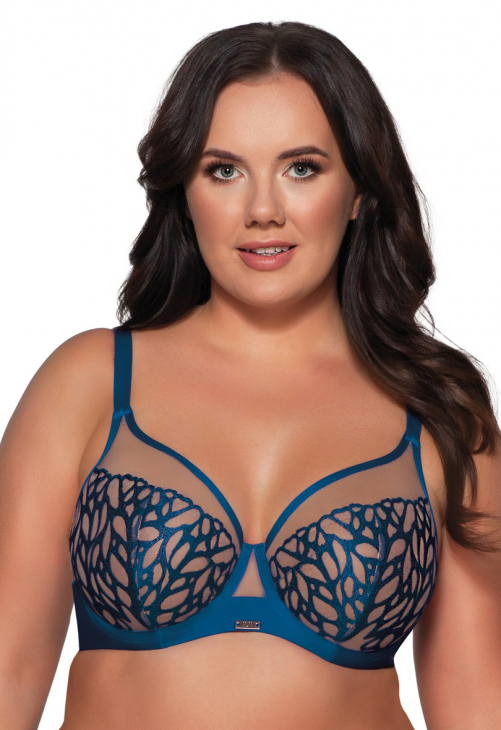 Biustonosz miękki na sprawdzonej konstrukcji 1396! Sensualny, pnący się ku górze niczym finezyjna korona haft dodaje powabu delikatnie modelującym piersi miękkim miseczkom. Czarująco osłonięty cielistym tiulem mostek oraz górne partie misek pobudzają wyobraźnię, a w wysmakowany sposób wyważone przezroczystości dopasowanych fig i brazylian kusząco podkreślają krągłości kobiecego ciała.