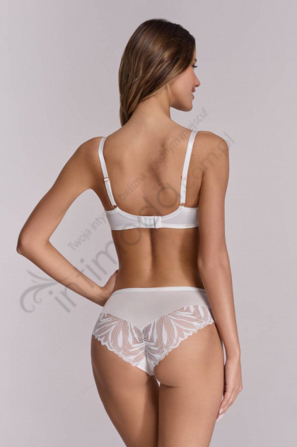 Biustonosz miękki, miseczki wykonane ze spójnego połączenia simplexu i gustownej koronki stabilnie podtrzymują piersi, zbierając je przy tym ku sobie, co czyni dekolt niezwykle powabnym i apetycznym. Umieszczone na mostku i przy zapięciu logowane blaszki rozświetlają jednokolorową Yasemin, dodając jej niewymuszonej elegancji.