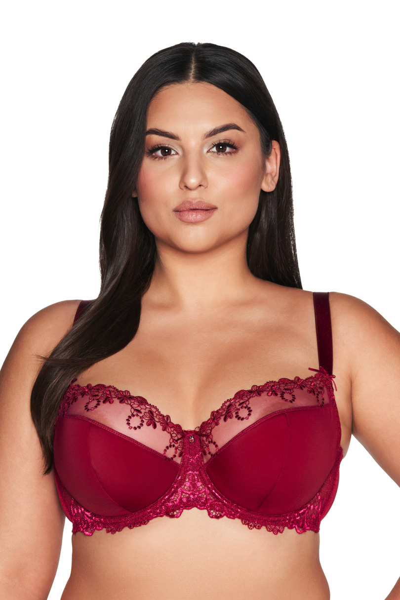 Najnowsza odsłona kultowego modelu AV 1030 zwraca uwagę nietypową barwą opalizującego rubinu. Bestsellerowa konstrukcja idealnie dopasowuje się do każdego rodzaju biustu, unosi i podtrzymuje piersi, zapewniając im maksimum komfortu. Biustonosz wykonany został z miękkiej pianki pokrytej elastyczną dzianiną w dolnej części miski oraz pięknego haftu w górnych partiach. Mostek obszyty koronką z kwiatowym motywem oraz plecy z elastycznej mikrofibry świetnie utrzymują biustonosz w odpowiedniej pozycji.