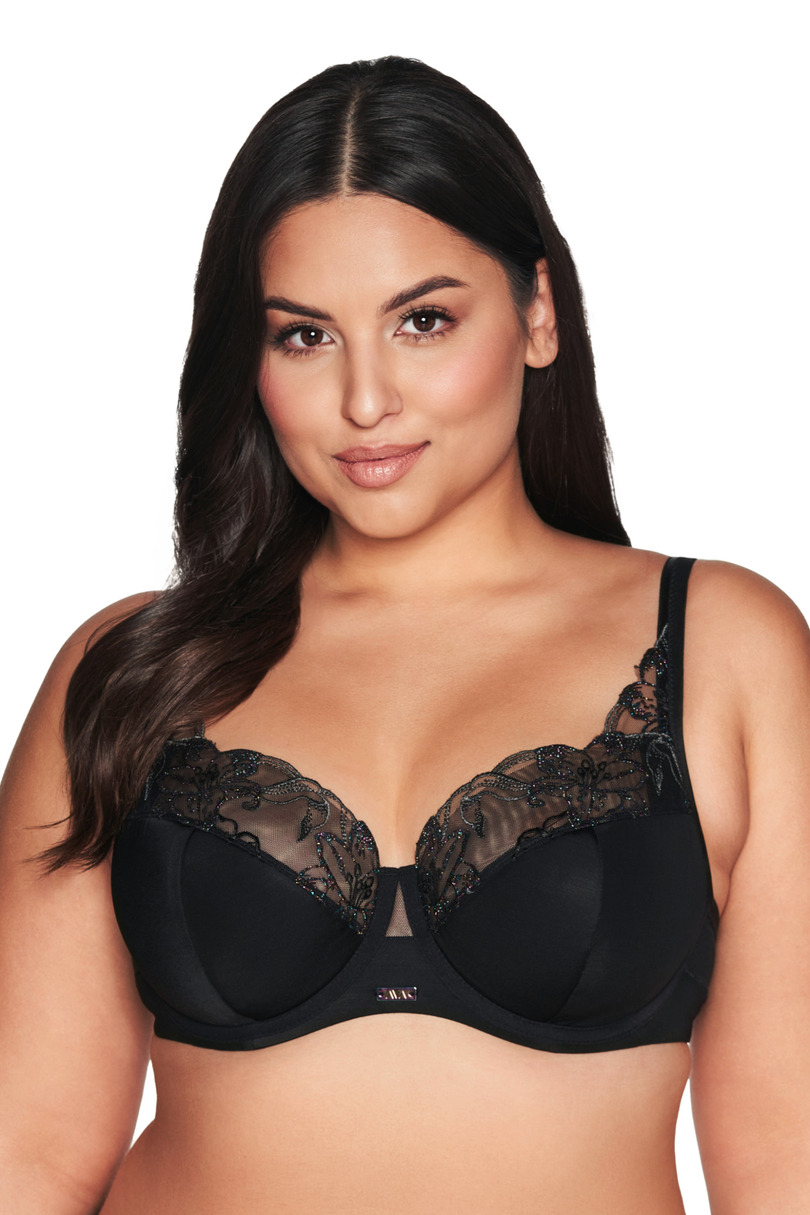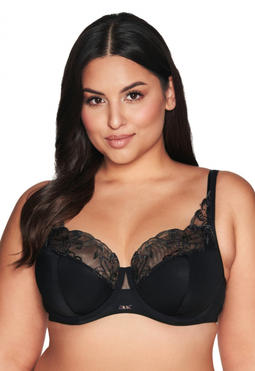Biustonosz o półusztywnianych miseczkach, wyścielonych miękką pianką, której celem jest optymalne kształtowanie piersi. Miseczki są wykończone czarnym tiulem i ozdobione niebanalnym kwiatowym haftem z energetycznymi błyskami. Dodatkowe haftowane wstawki między ramiączkiem a miseczką dodają lekkości i uroku. Konstrukcja tego biustonosza, będącego bestsellerem, zapewnia odpowiednie zebranie, uniesienie i komfortowe podtrzymanie biustu. Całość uzupełniają fikuśne figi.