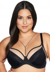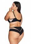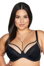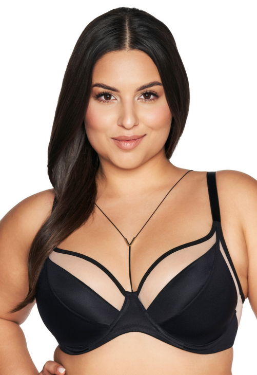 Biustonosz Viva to wyraz prostoty i uroku, zamknięty w modelu o konstrukcji K-2103 Bralette. Ten miękki model, idealny na co dzień, emanuje subtelnością i jednocześnie podkreśla piękno kobiecej sylwetki. Miseczki, utrzymane w kształcie braletki, swobodnie otulają krągłość piersi, zapewniając im delikatne podparcie i utrzymanie we właściwym położeniu. Czarna dzianina centralnej części biustonosza doskonale kontrastuje z cielistym tiulem, który delikatnie uwidacznia skórę, nadając całości subtelnego wydźwięku. Jednolity obwód, zdobiony geometrycznymi wstawkami na bokach, nie tylko stabilizuje biustonosz, ale również dodaje mu nuty nowoczesnego designu. Gładki mostek ukrywa sprytnie ukryty regulator, który stanowi minimalistyczną ozdobę rozpiętą w dekolcie. Ramiączka, nieodpinane, o szerokości dopasowanej do rozmiaru, są regulowane za pomocą metalowych, antyalergicznych regulatorów. Zapięcie dwurzędowe, trójstopniowe haftki na plecach umożliwia dostosowanie biustonosza do indywidualnych preferencji.