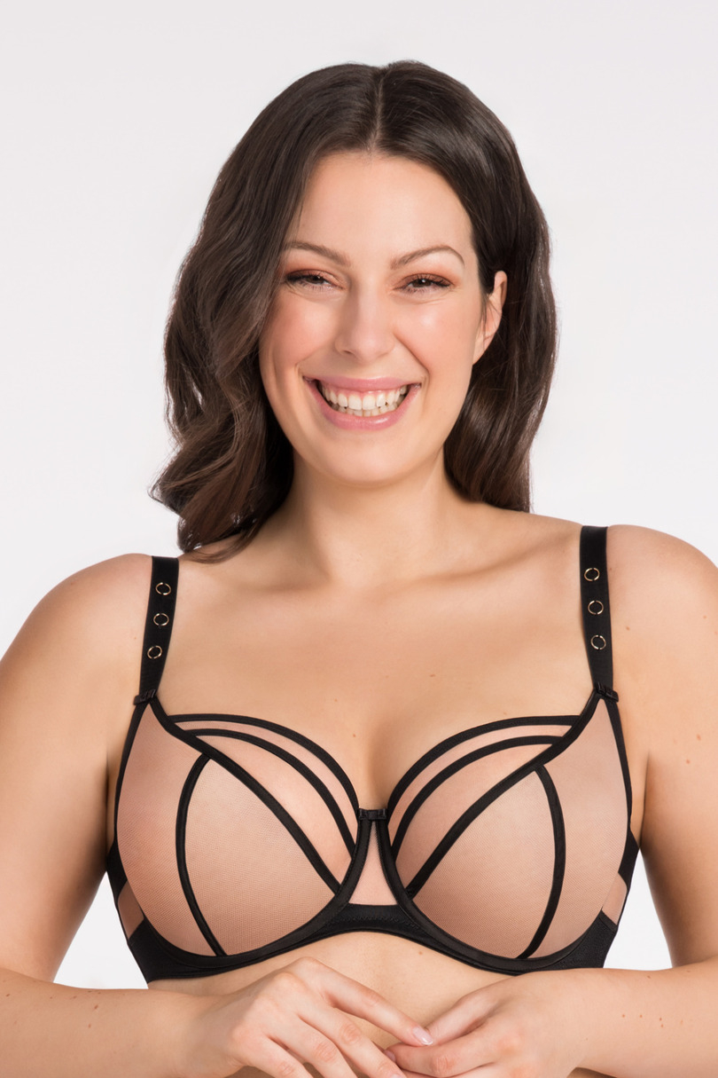 Biustonosz miękki przeznaczony dla kobiet ze średnim, dużym oraz bardzo dużym biustem. Zapewnia efekt bardzo mocnego uniesienia i zebrania biustu do środka, 3-częściowe miski wykonane z tiulu stabilnego. Szwy przykryte satynową matową taśmą. Na dekolcie odpinany ozdobny łańcuszek. Dla zwiększenia komfortu użytkowania biustonosz na plecach wykończony szeroką, miękką taśmą elastyczną. Fiszbiny boczne zapobiegające zwijaniu się materiału. W zależności od rozmiaru dwu lub trzyrzędowa haftka z trójstopniową regulacją obwodu. Nieodpinane, regulowane ramiączka w trzech szerokościach. Metalowe elementy w kolorze jasnego złota.