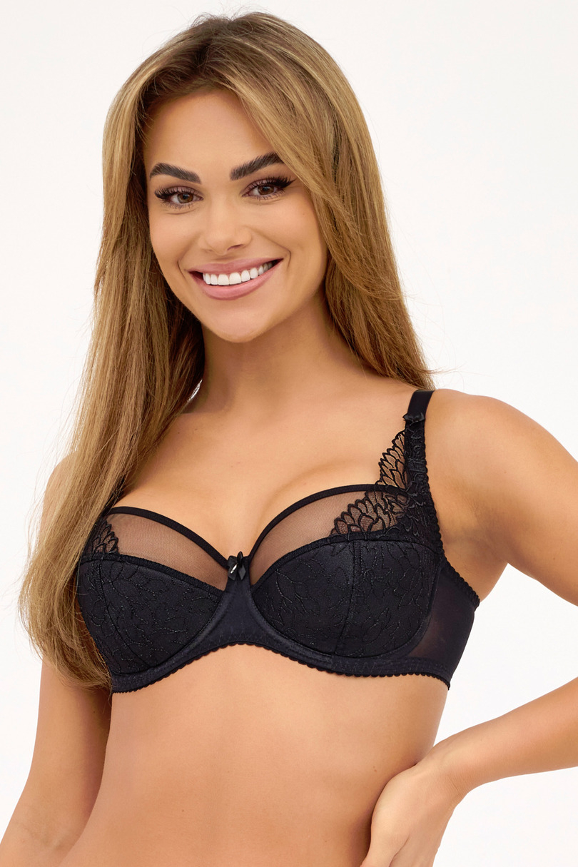 Konstrukcja: Miseczki pokrywają całą pierś, co zapewnia pełne podtrzymanie, miseczki są połączone z ramiączkami wyciągniętą koronką. Materiał: Miseczki w dole z pianki,pokrytej haftem, góra z tiuluTył biustonosza wykonany jest z Lycry, a wewnętrzna strona miseczek z 100% bawełny, co zwiększa komfort noszenia i jest delikatne dla skóry. Brak fiszbin bocznych: Zwiększa wygodę, szczególnie dla osób, które nie lubią fiszbin lub mają na nie uczulenie. Delikatne materiały: Są użyte w całym biustonoszu, aby uniknąć podrażnień skóry. Boczne usztywnienie: Pomaga zebrać biust do środka, co daje lepszy kształt i podtrzymanie. Efekt zaokrąglania piersi: Biustonosz nadaje piersiom okrągły kształt i tworzy ładny dekolt. Półotwarta linia dekoltu: Wraz z połączeniem poziomego i pionowego cięcia, zapewnia estetyczny wygląd dekoltu. Ten biustonosz jest idealnym wyborem dla kobiet poszukujących wygody połączonej z elegancją i dobrym podtrzymaniem.