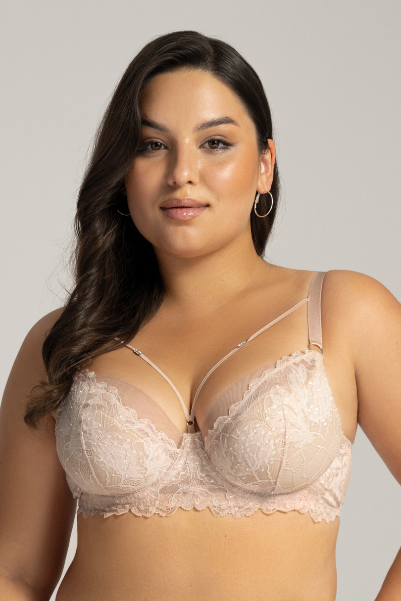 Biustonosz półusztywniony, konstrukcja K-925 AV 2154 Fiesta Semi Soft – zachwycający półusztywniany biustonosz, który łączy w sobie elegancję i komfort. Miseczki, wyścielone od dołu miękką pianką, zapewniają stabilne podtrzymanie, a ich górna część z cielistego tiulu stapia się ze skórą, tworząc efekt delikatnej przezroczystości. Zarówno miseczki, jak i bawet pokryte są bladoróżową koronką o srebrzystym połysku, która wdzięcznie podkreśla urok kobiecego ciała. Odpinane paseczki z cyrkoniami dodają biustonoszowi odrobiny blasku i pozwalają na indywidualne dopasowanie stylu. Koronkowy bawet subtelnie odciąża całość, nadając modelowi lekkości i wdzięku. Viva la Fiesta!