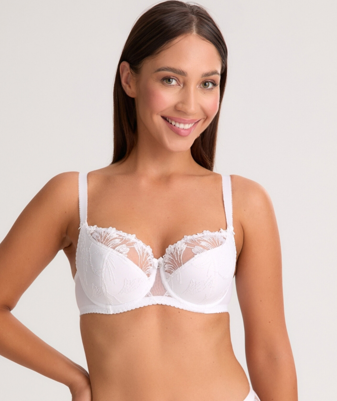 Półusztywniany biustonosz Paris w kolorze białym, o konstrukcji SS10. Górna część miseczki miękka uszyta z pięknego dwustronnego haftu stabilnego, dolna część miseczki usztywniona, uszyta z cienkiej pianki gorseciarskiej oraz plenu haftowanego. Plecy odcinane, uszyte z elastycznej mikrofibry.
