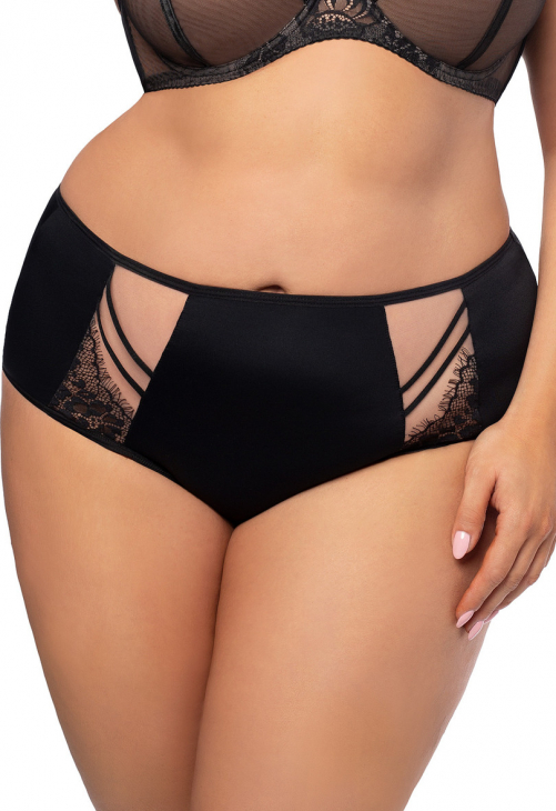 Figi damskie o wyższym stanie.Zabudowany fason zasłaniający prawie całe pośladki.Wykonane z tiulu elastycznego, tiulu stabilnego oraz stabilnej koronki z rzęskami.Skład:90% poliamid, 7%elastan,3% poliester.