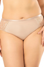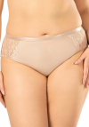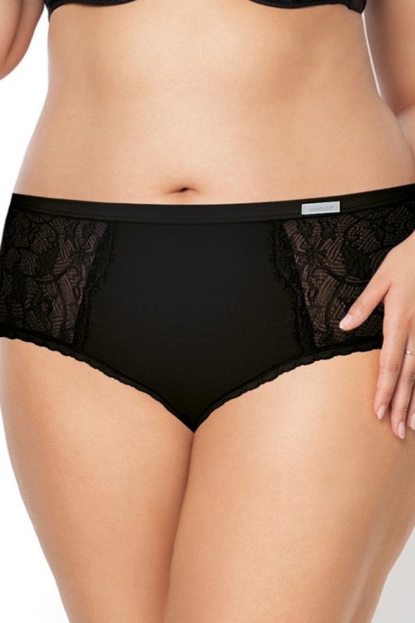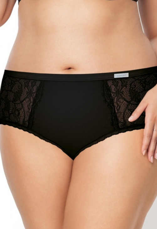 Figi damskie wykonane z gładkiej mikrofibry. Na biodrach i z tyłu delikatne koronkowe wstawki, a w pasie płaska wygodna gumka