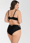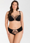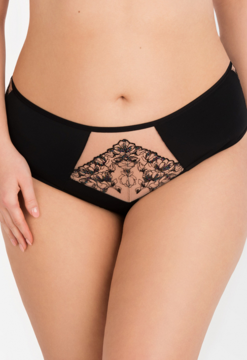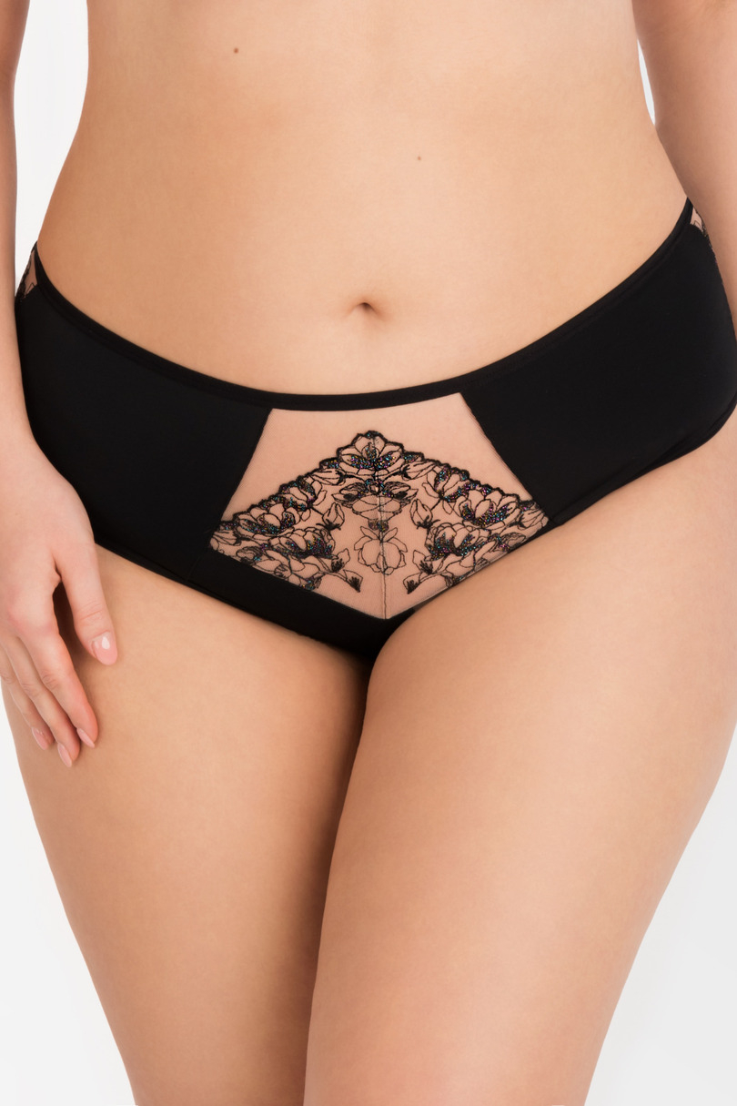 FIGI PEŁNE K 102 średni stan, zasłaniają prawie całe pośladki. PRZÓD: z kryjącej microfibry, wstawka z haftu podszytego tiulem stabilnym, nogawki wykończone wąską taśmą elastyczną. TYŁ: z kryjącej microfibry, po bokach wstawki z haftu podszytego tiulem stabilnym, nogawki wykończone poprzez podwinięcie microfibry na płasko, w pasie półokrągłe wycięcie z ozdobnym kółeczkiem. Pas wykończony szerszą taśmą elastyczną. Skład: 90% poliamid, 7% elastan, 3% poliester.