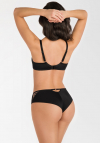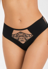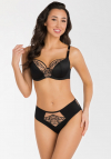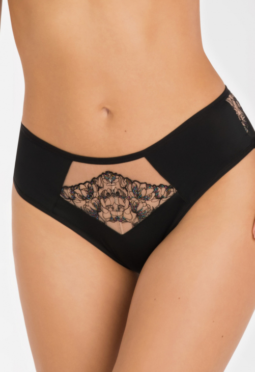 BRAZYLIANY K 103 niższy stan, bardziej odsłaniają i uwydatniają pośladki. PRZÓD: z kryjącej microfibry, wstawka z haftu podszytego tiulem stabilnym, nogawki wykończone wąską taśmą elastyczną. TYŁ: z kryjącej microfibry, po bokach wstawki z haftu podszytego tiulem stabilnym, nogawki wykończone poprzez podwinięcie microfibry na płasko, w pasie półokrągłe wycięcie z ozdobnym kółeczkiem. Pas wykończony szerszą taśmą elastyczną. Skład: 90% poliamid, 7% elastan, 3% poliester.