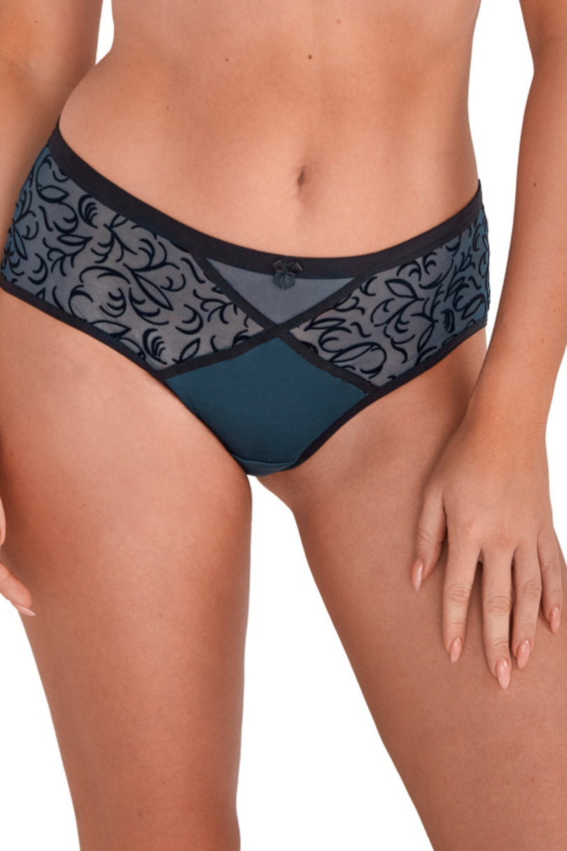 Figi pełne wykonane z miękkiej siatki pokrytej czarnym flokiem. Tył z gładkiej mikrofibry, zakończonej podwójnie złożonym tiulem. Skład: 72% Poliamid, 18% Elastan, 10% Bawełna