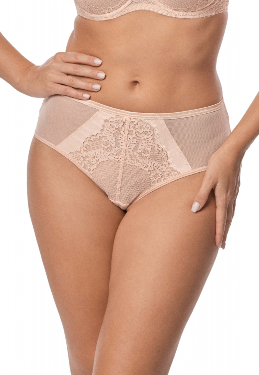 Klasyczne figi damskie z przodu delikatna koronka podszyta tiulem. Zabudowane biodra z transparentnej siateczki.