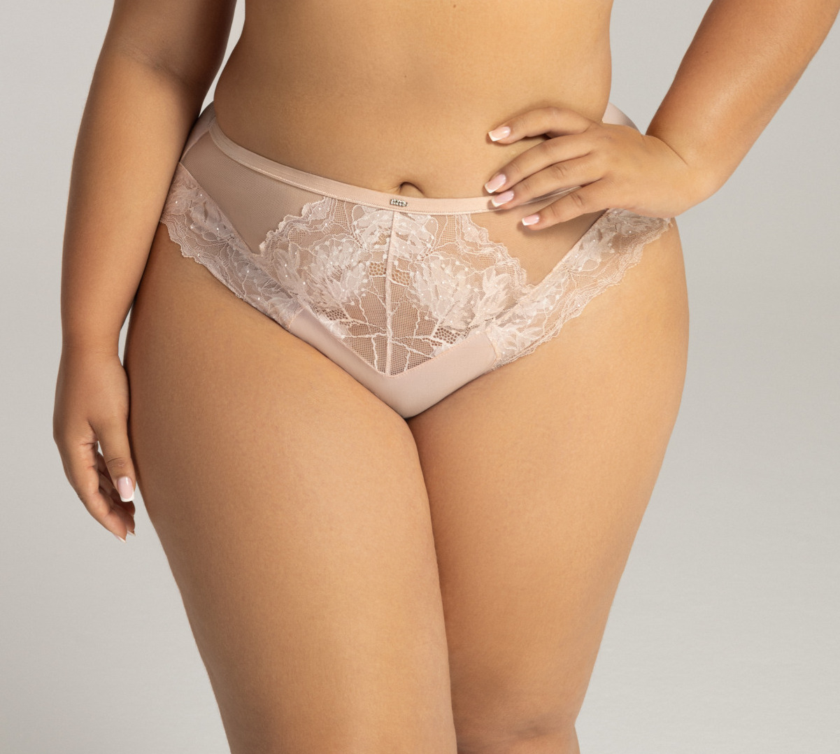 Majteczki z wysokim stanem o pełnym kroju. Wykonane z siateczki i połyskującej koronki. Z przodu ozdobny paseczek z cyrkoniami.