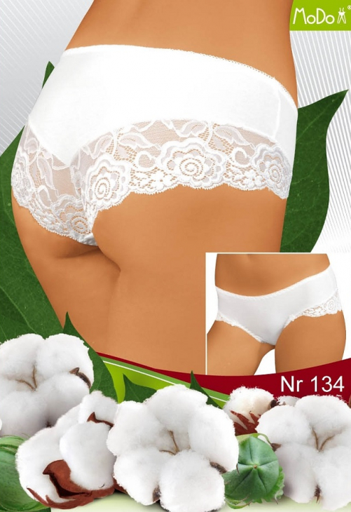 Figi damskie o obniżonej linii bioder, u dołu obszyte efektowną koronką o kwiatowym motywie, wykonane z bawełny 95% i dodatku elastanu.