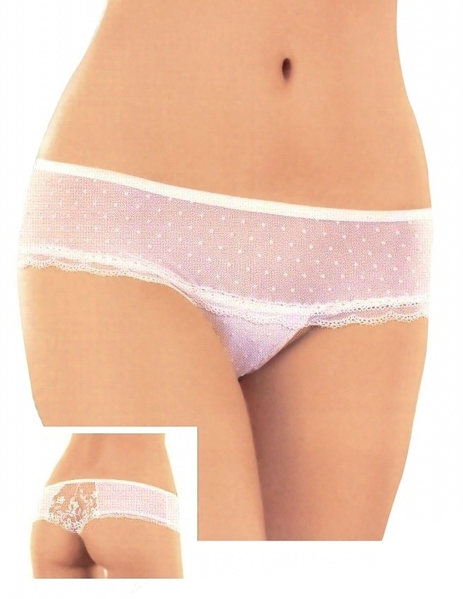 Stringi damskie z delikatnej siateczki w kropki. Tył ozdobiony efektownym haftem w kwiaty. Skład: poliamid 85%, elastan 15%.