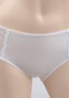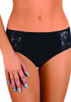 Komfortowe figi damskie, zabudowane na biodrach. Wykonane z wysokiej jakości miękkiej bawełny. Biodra ozdobione efektowną, ażurową koronką o kwiatowym wzorze. Tył gładki, jednolity. Materiał: 95% bawełna, 5% elastan.