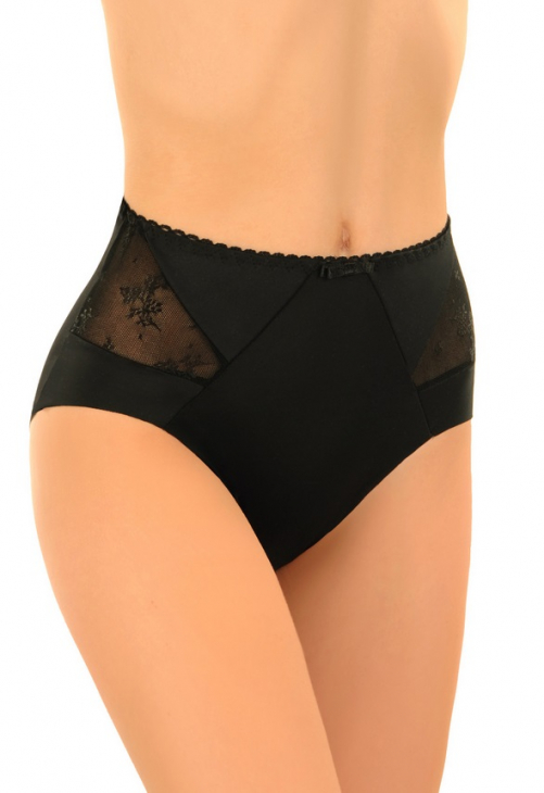 Figi damskie wysokie z delikatnej mikrofibry. Przód zdobią koronkowe wstawki. Nogawki cięte laserowo, nieodznaczające się pod ubraniem. Skład: 85% poliamid, 15% elastan.