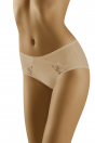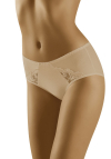 Komfortowe figi o nieco wyższym kroju z elegancko zdobionym przodem. Uda z gładkim wykończeniem, tył również gładki. Rejon talii muśnięty delikatną, piękną koronką. Skład: 90% bawełna, 7% elastan, 3% poliamid.