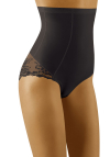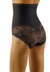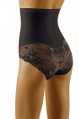 Wysokie figi zdobione koronką na pośladkach. Linia modelująca rejon brzucha i bioder. Przód i tył gładki, wykonany ze spcjalistycznej dzianiny, subtelnie wysmukla ciało i wpływa na poprawę kształtów ciała. Wyższy stan to także optyczne wyszczuplenie rejonu talii, góra od wewnątrz podszyta silikonem, zwiększa komfort noszenia bielizny i zabezpiecza ją przed zsuwaniem się z ciała. Skład: 58% poliamid, 42% elastan.
