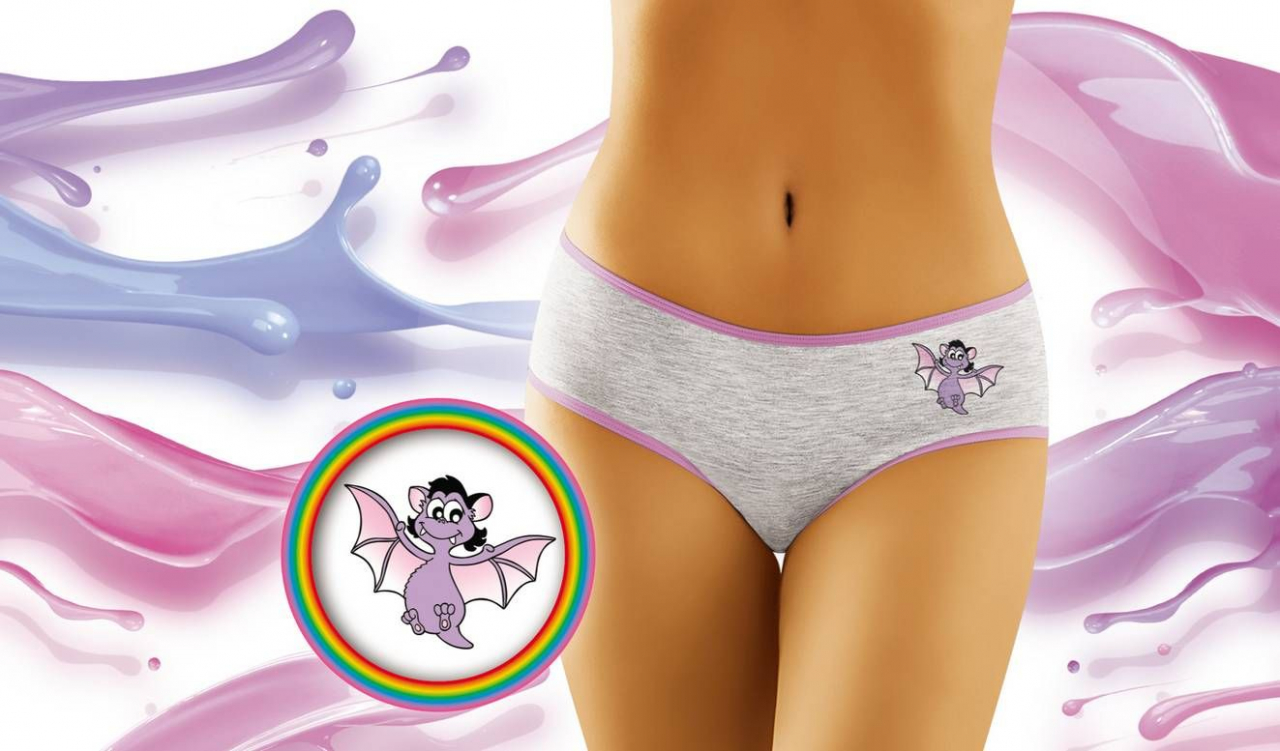 Poznaj najnowszą kolekcję bielizny producenta Wol-bar! Linia Funny to pomysłowe, zabawne nadruki, ciekawa kolorystyka oraz przede wszystkim najwyższa jakość (naturalne włókna, najlepsze dzianiny oraz fason, który zadba o Twój komfort i wygodę). W tej odsłonie - prawie Drakula czyli słodki, fioletowy nietoperz z dwoma ostrymi kłami...