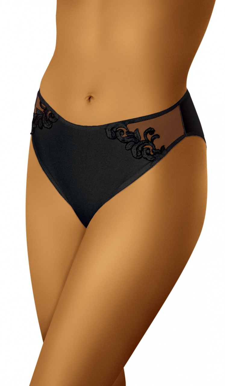 Klasyczne, bardzo kobiece figi z ażurowym zdobieniem po bokach bioder. Wykonane z elastycznej, wytrzymałej dzianiny, doskonale dopasowują się do kształtów ciała. Skład: 83% poliamid, 17% elastan.