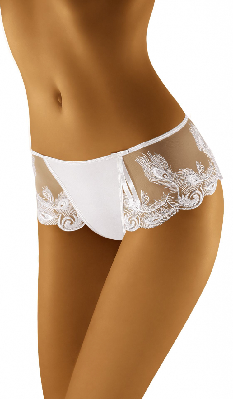 Stringo-shorty Oshi to bielizna pokryta efektownym haftem w postaci pawich oczek. W przedniej części zupełnie gładka, po bokach prześwitująca. Motyw zaciekawia spojrzenie i jednocześnie pozwala bieliźnie wyróżnić się spośród innych propozycji. Skład: 83% poliamid, 17% elastan.