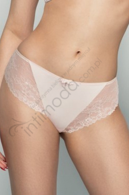 Biustonosz bez fiszbin typu push-up. Miski modelowane termiczne obszyte koronką delikatnie ozdobione marszczeniami. Niski mostek eksponuje dekolt i nadaje piersiom okrągły kształt. Boczki z podwójnej tiulowej siateczki wzmocnione pionowa fiszbiną, zapinany na trzy rzędy haftek.
