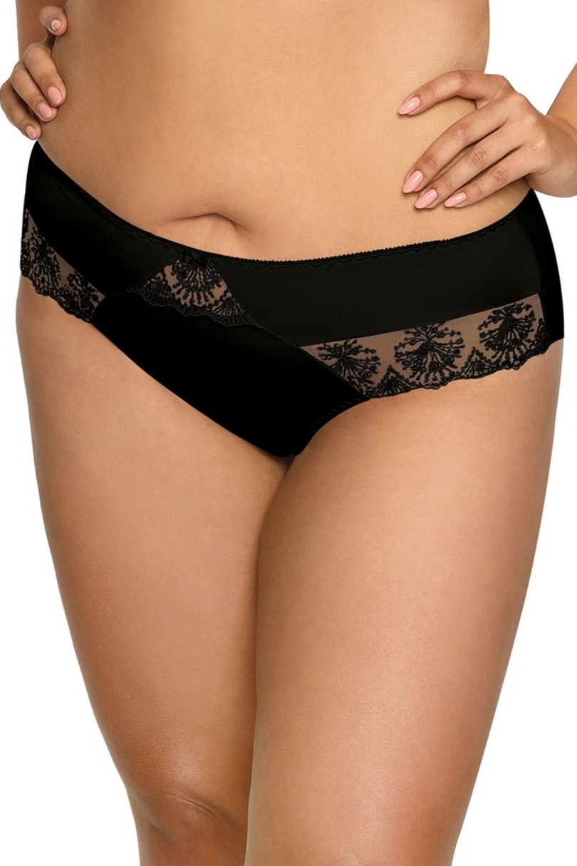 Brazyliany z koronką z przodu, tył majtek wykończony podwójnie składaną szeroką listwą z tiulu. skład: 91% poliamid, 5% bawełna, 4% elastan
