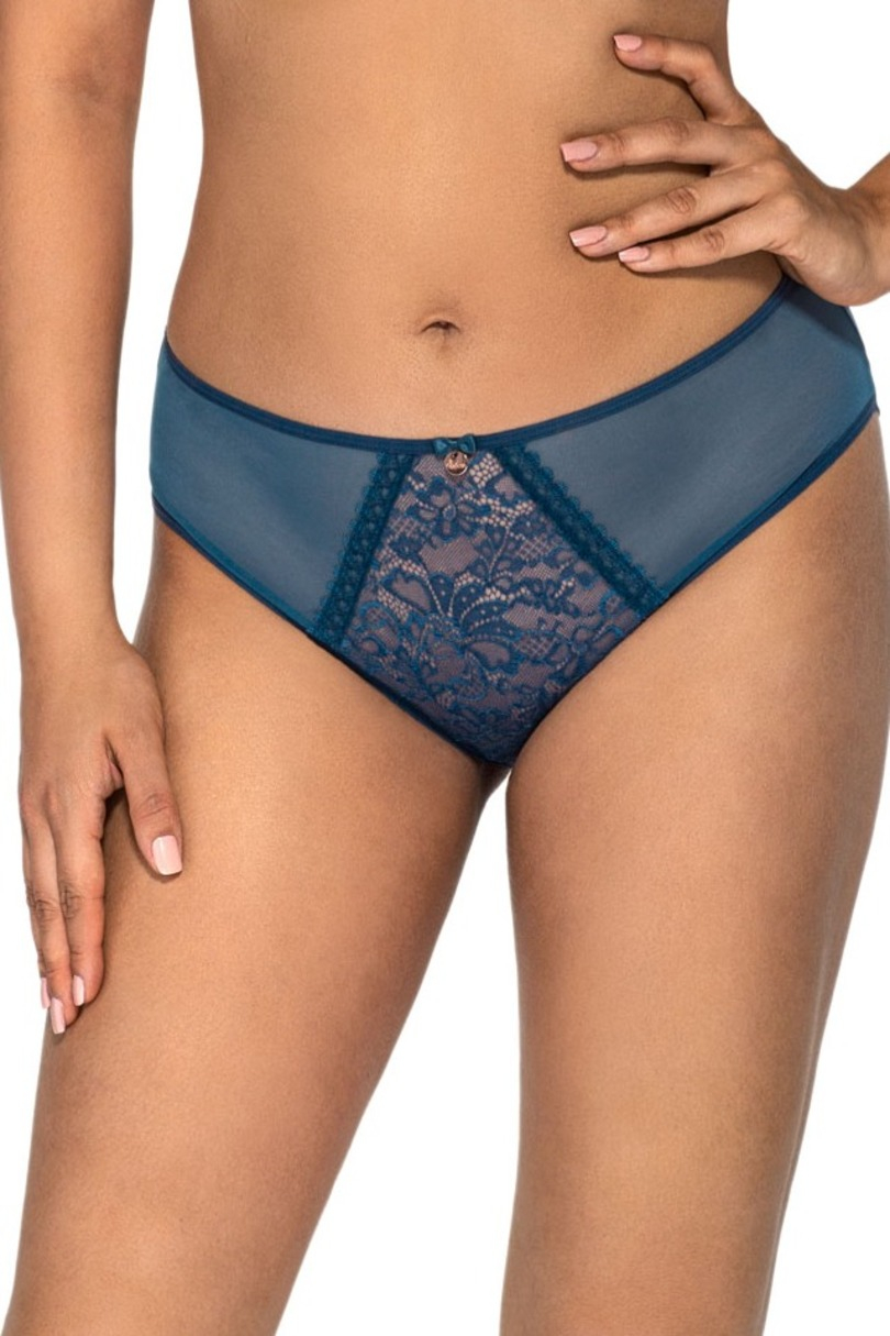 Figi brazyliany w wyjątkowym morskim kolorze. Przód zdobiony koronką.