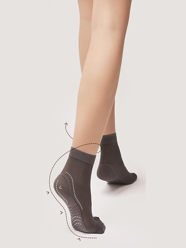 Bardzo praktyczne skarpetki o grubości 40 DEN z efektem masażu stóp i bezuciskowym ściągaczem. Stworzone w technologii Silver Fresh, dzięki czemu skóra pozostaje sucha i świeża. Ograniczony rozwój grzybów i bakterii za sprawą jonów srebra. Skład: 80% poliamid, 20% elastan.