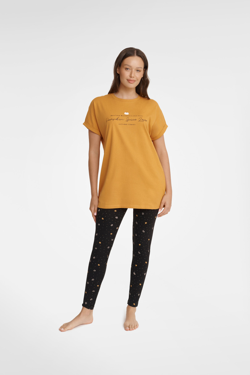 Piżama damska z krótkim rękawem, z przodu nadruk. Spodnie długie, obcisłe, w pasie szekora guma. Skład koszulka: 100% bawełna, spodnie 95% bawełna, 5% elastan.