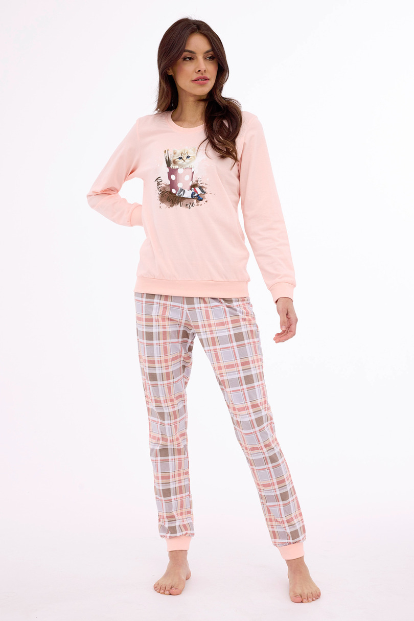 Piżama damska uszyta z wysokiej jakości miękkiej bawełny. Koszulka z długim rękawem, przód ozdobiony kolorowym nadrukiem. Do kompletu długie w kratę spodnie. Dekolt, mankiety oraz dół koszulki z nogawki zakończone wygodnym ściągaczem. Piżamka pakowana w pudełko. Skład: 100% Bawełna