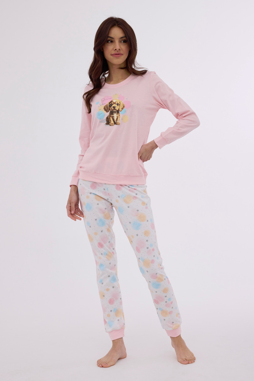Piżama damska uszyta z wysokiej jakości miękkiej bawełny. Koszulka z długim rękawem, przód ozdobiony kolorowym nadrukiem. Do kompletu długie wzorzyste spodnie. Dekolt, mankiety oraz dół koszulki z nogawki zakończone wygodnym ściągaczem. Piżamka pakowana w pudełko. Skład: 100% Bawełna