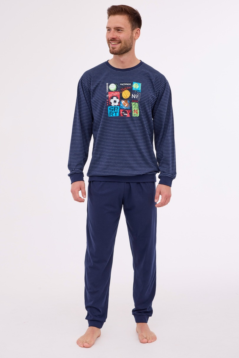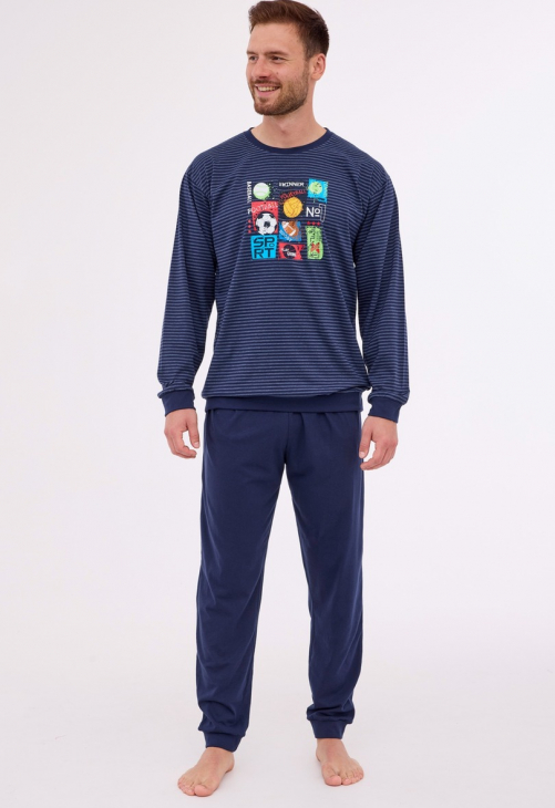 Piżama męska uszyta z wysokiej jakości miękkiej bawełny. Koszulka z długim rękawem, w paski.Do kompletu długie jednolite spodnie. Dekolt, mankiety oraz dół koszulki z nogawki zakończone wygodnym ściągaczem. Piżamka pakowana w pudełko.