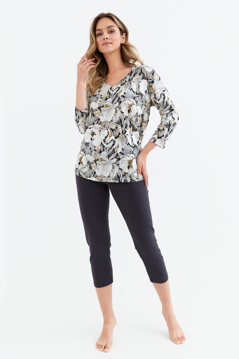 Piżama damska 415 Cana w kwiaty iron. materiał bluzka - singiel jersey bawełna 100%, spodnie bawełna 95%, elastan 5% wygodna bluzka o kroju oversize w piękny kwiatowy wzór w odcieniach grafitu i beżu rękaw 3/4 odszyty trójkatny dekolt proste spodnie 7/8 w kolorze grafitu