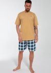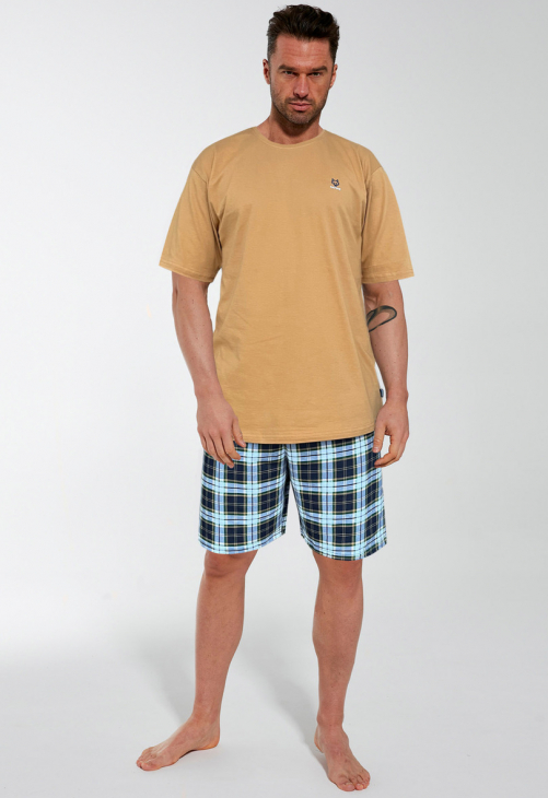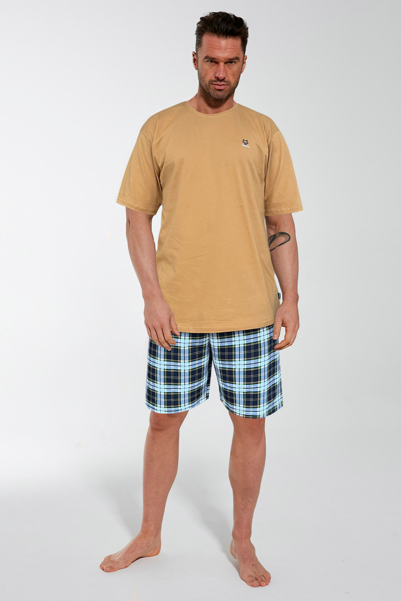 Piżama męska uszyta z wysokiej jakości miękkiej bawełny. Koszulka z krótkim rękawem, na wysokości klatki piersiowej delikatny nadruk. Spodenki krótkie w kratę. Pakowana w pudełko. Skład: 100% Bawełna