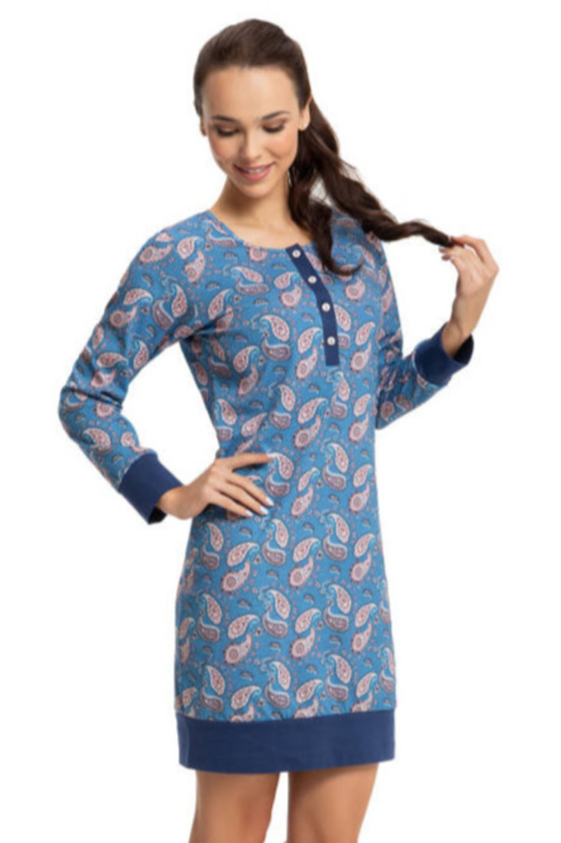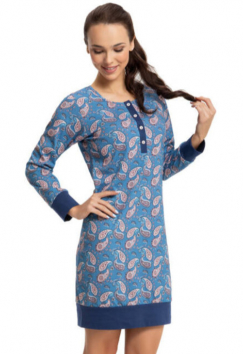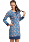 Koszula damska wykonana z dzianiny w kwiatowy roślinny wzór, w modnym zestawieniu kolorystycznym. Dekolt półokrągły z zapięciem typu polo na 4 guziki. Rękawy długie, wykończone ściągaczem. Dół koszuli wykończony również praktycznym jednobarwnym ściągaczem. Skład surowcowy: 100% bawełna