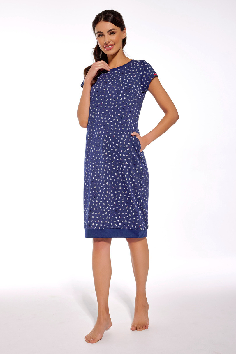Koszula damska z krótkim rękawem, uszyta z miękkiej wzorzystej bawełny. Dół koszuli obszyty delikatnym ściągaczem. Pakowana w pudełko. skład: 100% bawełna
