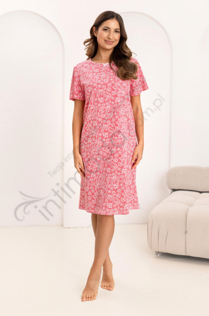 Koszula damska z krótkim rękawem, uszyta z miękkiej jednolitej bawełny. Na wysokości klatki piersiowej kolorowy nadruk. Dekolt okrągły, długość koszuli przed kolano. Pakowana w pudełko. skład: 100% bawełna