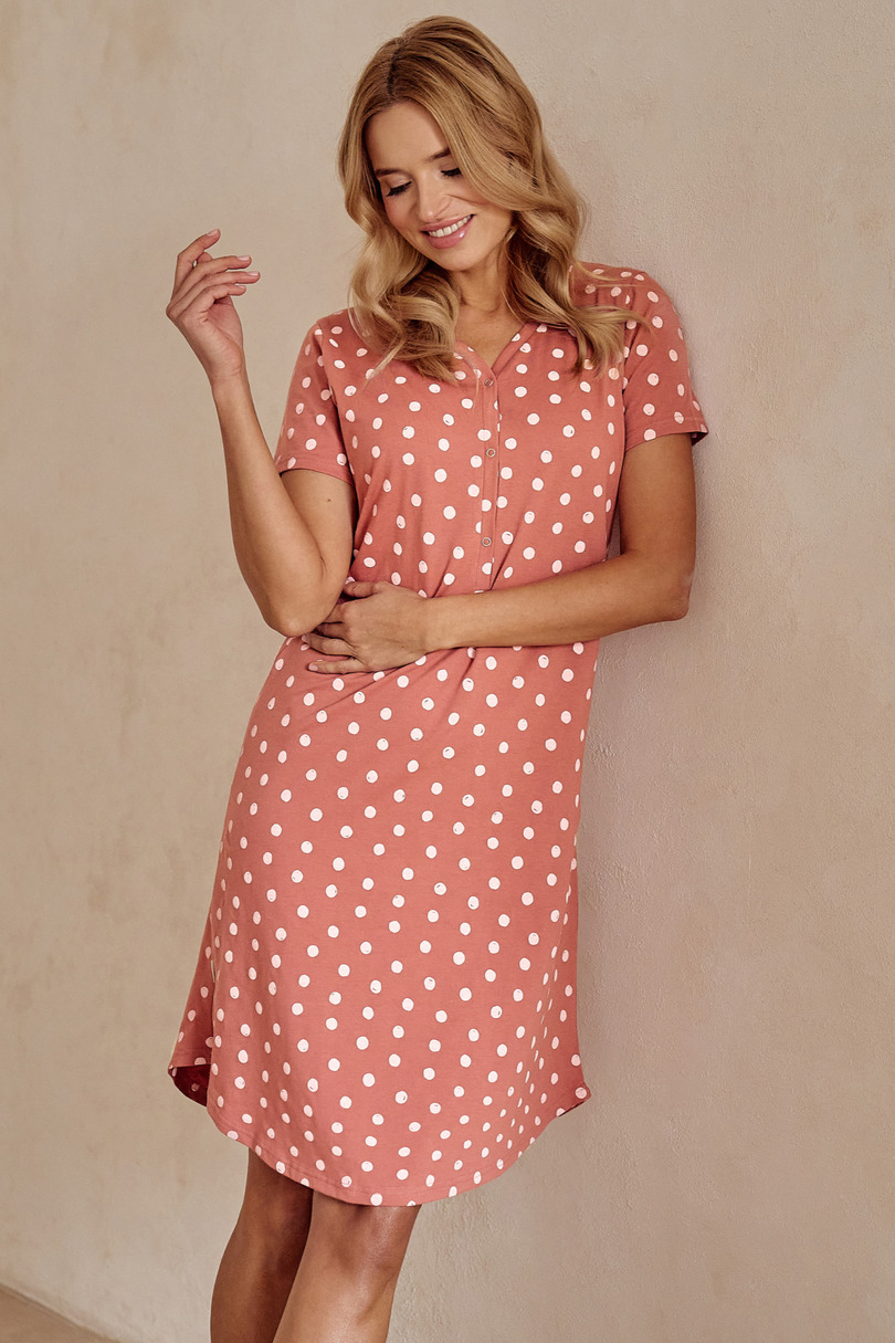 Koszula damska z krótkim rękawem, uszyta z delikatnej bawełny w grochy. Dekolt w serek zapinany na napu. Długość koszuli do kolan. skład: 100% bawełna