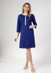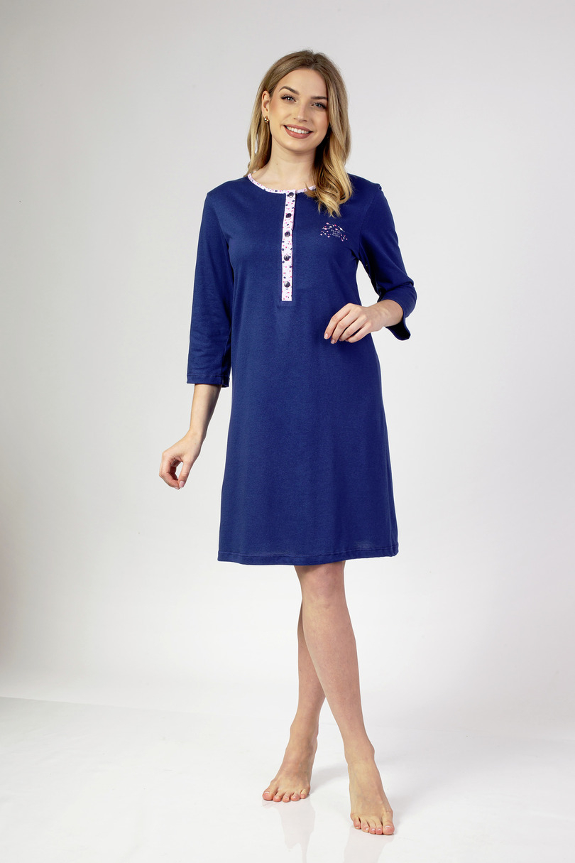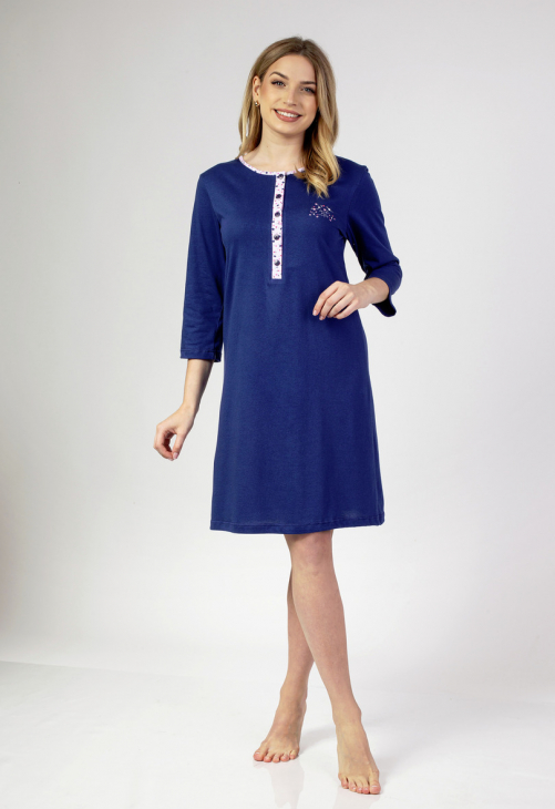 Koszula damska z rękawem długości 3/4, uszyta z delikatnej bawełny, przód koszuli rozpinany na guziczki. Dekolt okrągły. Długość koszuli przed kolano. Skład: 100% Bawełna